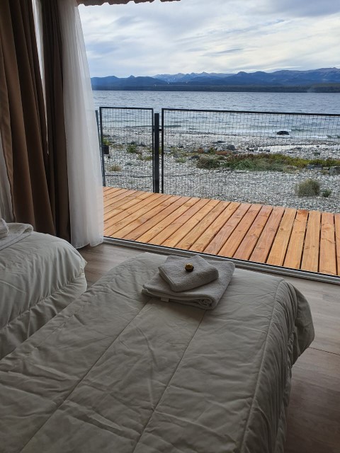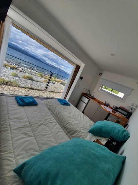 CAPACIDAD 2 personas A pocos minutos de Bariloche, con inmejorable vista al Lago Nahuel Huapi. Posee cama matrimonial. Vajilla completa para 2 pax , Cocina con anafe. Heladera. Horno grill. Frío / Calor. Desayunador. Deck. Salida directa a la playa.